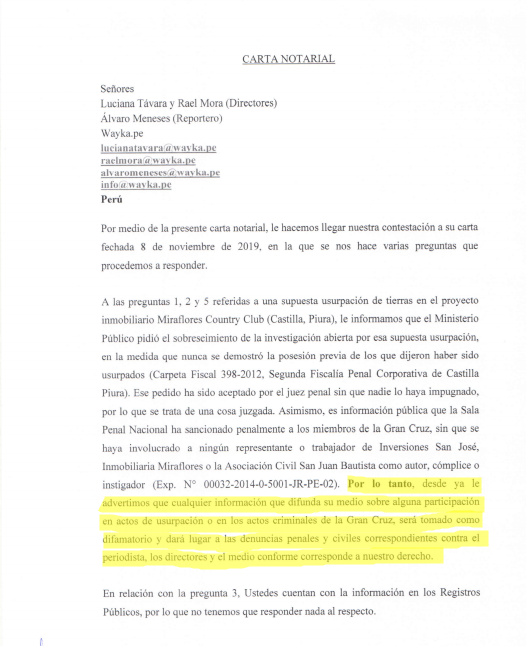 Las preguntas parecen no haber sido del agrado de la empresa. A través de una carta notarial, la abogada de Inversiones San José, Leslie Whittembury, advirtió al portal Wayka.pe que «cualquier información que difunda [este] medio sobre alguna participación en actos de usurpación o en los actos criminales de la Gran Cruz, será tomado como difamatorio y dará lugar a las denuncias penales y civiles correspondientes contra el periodista, los directores».