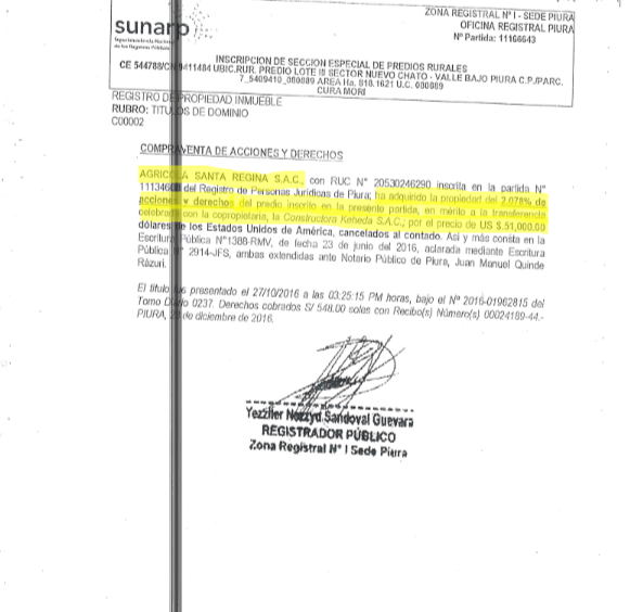 Por 51 mil dólares al contado, Keheda SAC también hizo copropietaria del 2.078% de 818.1621 hectáreas de sus tierras a Inversiones Santa Regina SAC (antes Agrícola Santa Regina SAC), una empresa de Piura que en marzo del 2016 recibió 1 millón 535 mil 180 soles de Inversiones San José, compañía que fue dirigida por 3 sodálites con más de 30 años en la secta religiosa: Erwin Scheuch Pool, José Ambrozic Velezmorro y Juan Carlos Len Álvarez.