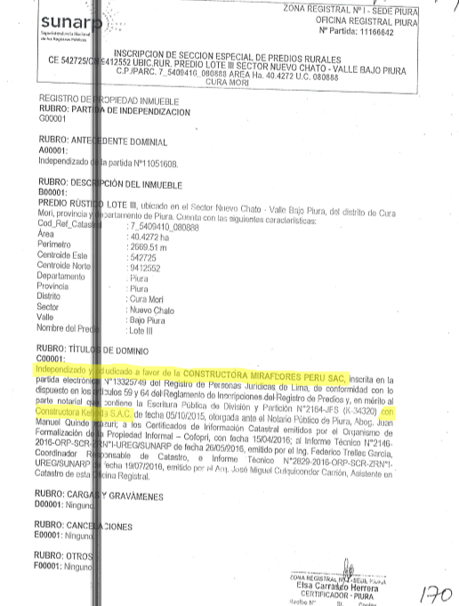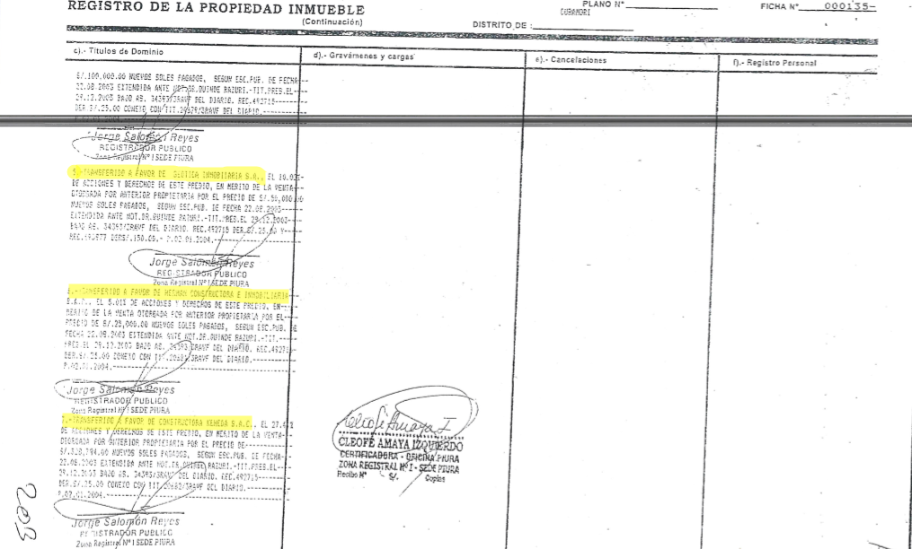 Por el 20.03% de las tierras, Agroindustrias Marvel SAC pagó solo S/ 100,000, mientras que a Geótica Inmobiliaria S.A le costó S/ 50,000 (10.3%). Por su lado, Herman Constructora pagó S/ 25,000 por (5.01%) y la Constructora Keheda S/ 328,794 (27.4%). Todos estos movimientos se realizaron con el aval del mismo registrador público: Jorge Salomón Reyes, también conocido como ‘El Veloz’.