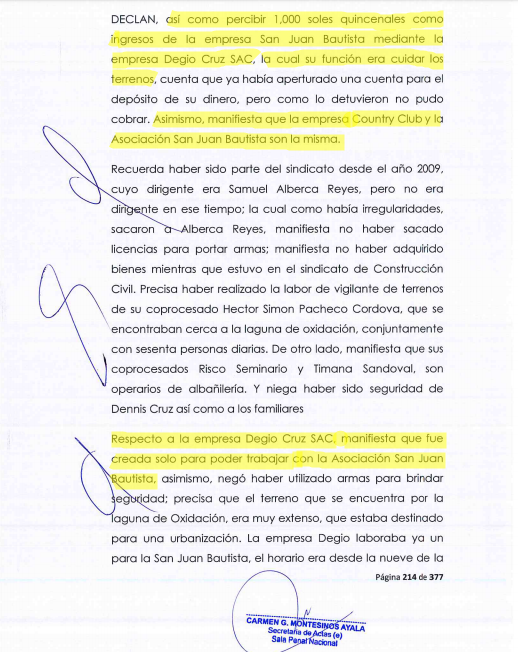 Ante el Colegiado A de la Sala Penal Nacional, la defensa legal de José Pacherre Rentería, miembro de la banda y sentenciado a 8 años de cárcel, declaró que este percibía «mil soles quincenales como ingresos de la empresa San Juan Bautista mediante la empresa Degio Cruz S.A.C., cuya función era cuidar los terrenos (de Castilla)». El criminal condenado por los delitos de asociación ilícita para delinquir, también aseguró que Degio Cruz S.A.C «fue creada solo para poder trabajar con la Asociación San Juan Bautista».