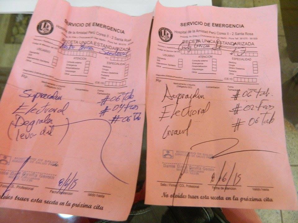 Crsitian Requena se mostró contrariado al revisar ambas recetas y darse cuenta que el médico Dante David Dávila receta medicina como «supracalm» y «electroral» que no son otra cosa que la presentación comercial del paracetamol y de los rehidratantes o sueros que se entregan en los establecimientos del MINSA, según explicó el mismo Requena.