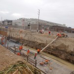 Son 120 los obreros de la empresa contratista Yaksetig que trabajan en la construcción de la cisterna de concreto, de 305.60 metros de largo por 7.45 de ancho, que almacenará hasta 9 mil metros cúbicos de agua que discurrirían ante un eventual Fenómeno de El Niño. El levantamiento de esta gigante poza evitará que la zona se convierta en intransitable, llena de charcos y lodazal, como ha ocurrido en años anteriores.