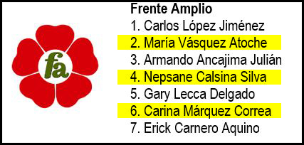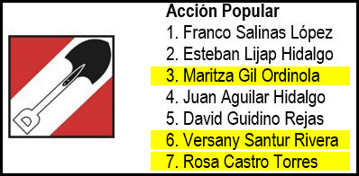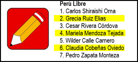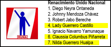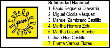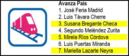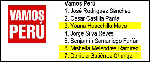 Asimismo, en el Frepap, Avanza País, Acción Popular, Juntos por el Perú, y Vamos Perú, las primeras posiciones son para los hombres.