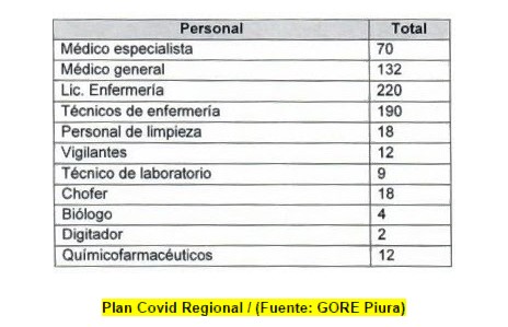 Según el Plan regional de reforzamiento de los servicios de salud y contención del Covid (modificado) aprobado con Resolución ejecutiva del pasado 24 de abril, las autoridades de salud proyectaron que Piura necesitará 687 trabajadores de la salud, entre médicos, enfermeras y técnicos. Sin embargo, el director regional de Salud, Víctor Távara Córdova, reveló que hasta la fecha solo cuentan con el 30% de este personal.
