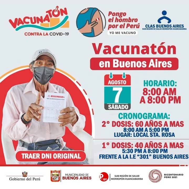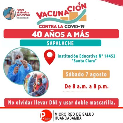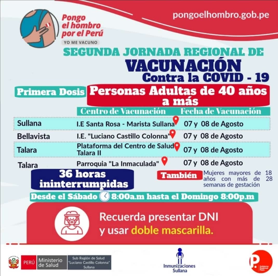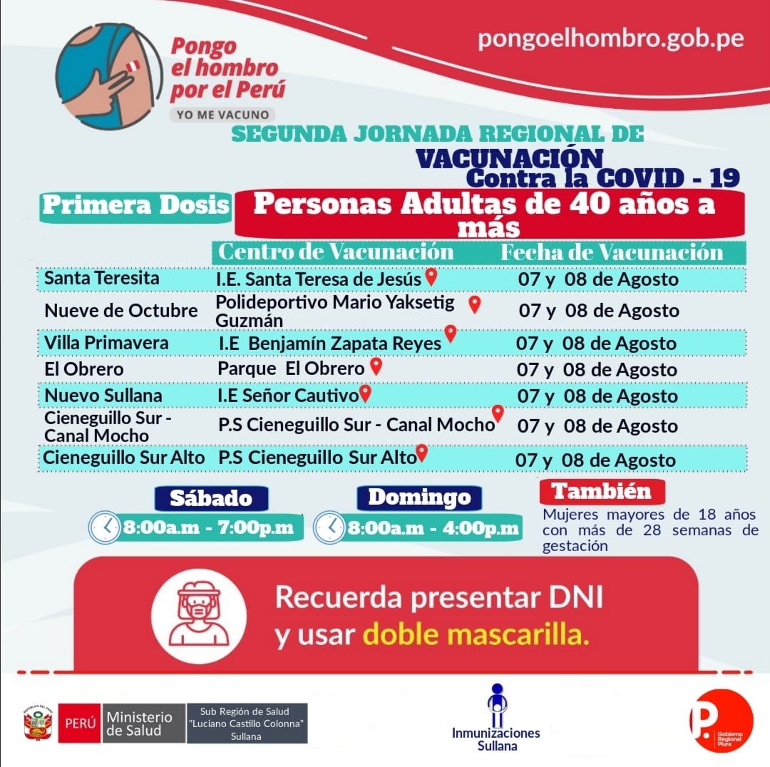 La Dirección Regional de Salud de Piura y el Ministerio de Salud anunciaron que este sábado 07 y domingo 08 de agosto desarrollarán la segunda jornada regional de vacunación dirigida a los adultos de 40 años a más en seis de las ocho provincias de la región: Piura, Sullana, Talara, Huancabamba, Sechura y Morropón.