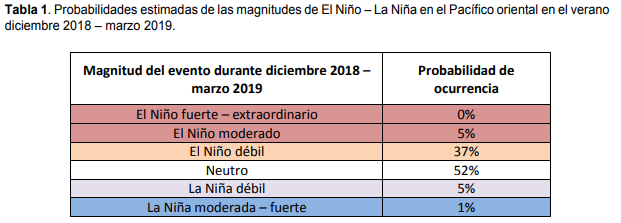 Durante la Mesa regional convocada por la Presidencia del Consejo de Ministros (PCM) en Lima, el jefe de INDECI dio a conocer que el último informe del Estudio Nacional del Fenómeno El Niño (ENFEN) señala que hay un 42% de probabilidades de que este fenómeno se presente durante el próximo verano diciembre 2018 – marzo 2019.