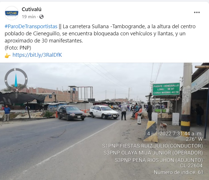 11:10 AM La Carretera Piura-Sullana continúa bloqueada. Los manifestantes se mantendrán en el lugar por el resto del día. Incumplieron acuerdo al que llegaron con la PNP.