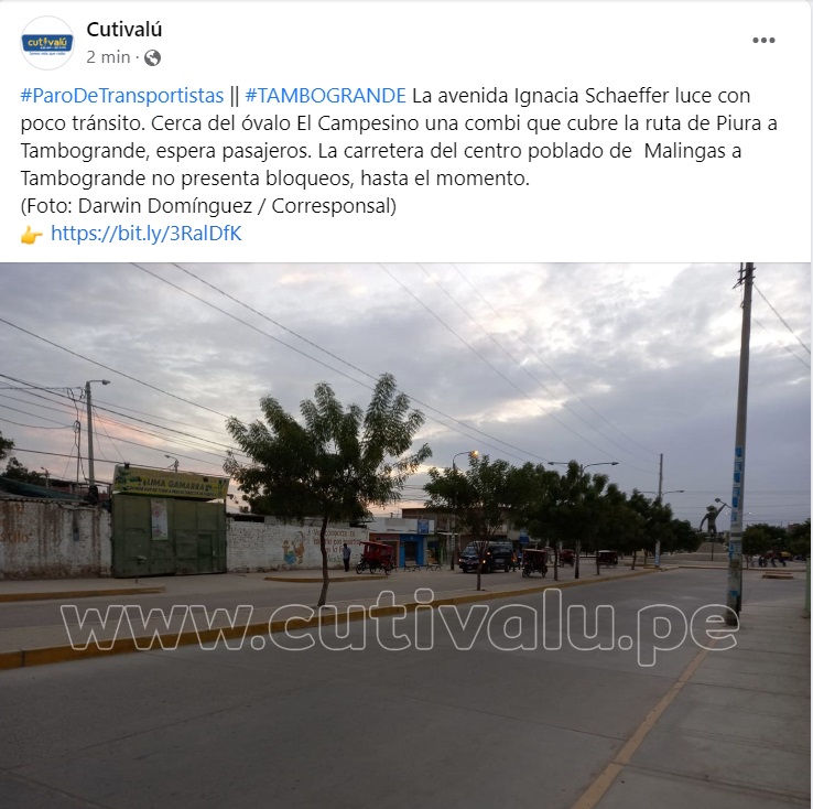 07:10 AM CATACAOS Policía libera carretera Piura-Catacaos que había sido tomada por transportistas en el paro que vienen realizando. Conductores de vehículos menores permanecen en la zona.