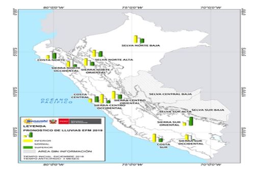 En ese sentido, el Servicio Nacional de Meteorología e Hidrología (Senamhi) pronostica que para el primer trimestre del 2019 se esperan lluvias entre normal a superior en la costa norte, aunque es habitual que en los meses de febrero y, particularmente, marzo puedan ocurrir eventos puntuales de lluvia intensa.