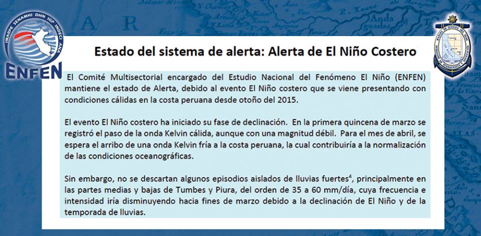 El Comité Multisectorial encargado del Estudio Nacional del Fenómeno El Niño informa que el evento El Niño costero ha iniciado su fase de declinación.