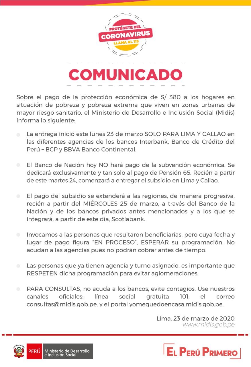 Se rompió la medida de aislamiento social y se generó un caos para intentar cobrar el bono, sin embargo se emitió un comunicado donde se detalla que el pago del bono para las regiones se realizará a partir del día miércoles.