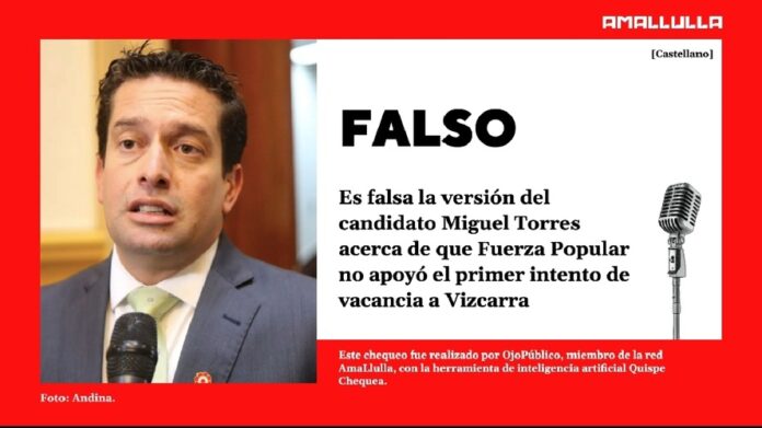 Durante una entrevista en un canal multiplataforma, Miguel Torres, candidato a la segunda vicepresidencia y al Senado por Fuerza Popular, se refirió al primer intento de vacancia al expresidente de la república, Martín Vizcarra. En ese contexto, dijo lo siguiente: “Cuando se intentó vacar por primera vez al señor Vizcarra, […] nosotros no apoyamos”.