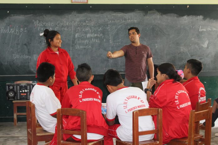 Jair Cohello Hermoza, director y miembro de la escuela de teatro e improvisación “ARTOS”, facilitó un taller a los educandos sobre “Acondicionamiento teatral e improvisación” para ordenar la historia que los colegiales seleccionaron para representar actos cotidianos de ética.