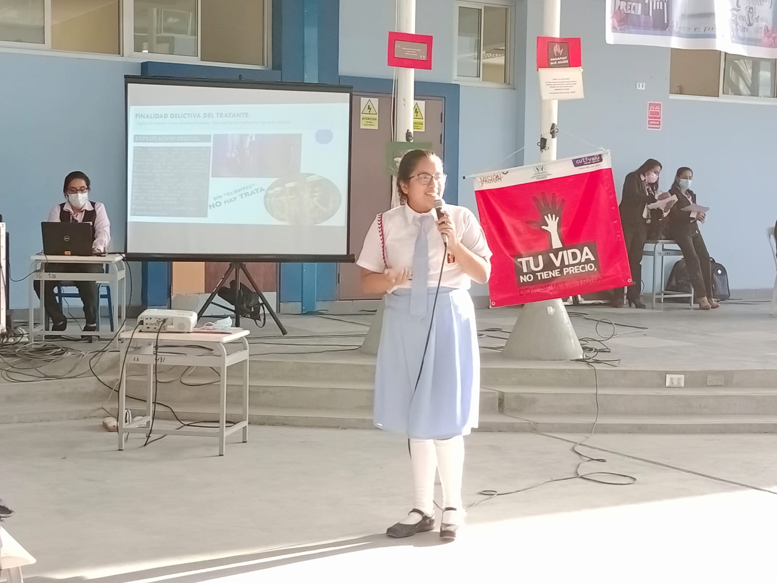 En otro momento, la alumna coordinadora de Lideresas contra la violencia de la institución educativa, Mariangel Nizama Panta, reflexionó sobre los fines de la trata de personas, entre los que están la explotación sexual, la explotación laboral, el tráfico de órganos y la mendicidad.