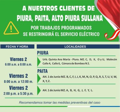 Enosa ha programado una serie de trabajos de mantenimiento por lo cual se restringirá el servicio en diferentes sectores de Piura, Catacaos, Cura Mori, Sullana y Chulucanas durante el mes de agosto.