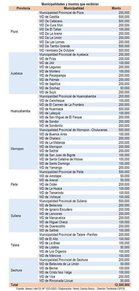 En la región Piura, las municipalidades provinciales y distritales recibirán S/ 12 millones 500 mil que deben utilizar para entregar alimentos y otros productos esenciales a “hogares vulnerables con bajos ingresos y que se mantienen a partir de actividades independientes”.