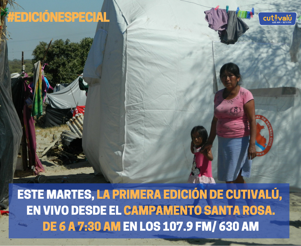 Edición Especial. Al cumplirse un año del desborde del río Piura, la Primera Edición de Cutivalú Informa (6:00 – 7:30 am) de este martes 27 de marzo será en vivo y en directo desde el campamento de damnificados Santa Rosa, en el Bajo Piura. Sigue nuestra programación especial en los 107.9 FM / 630 AM o en www.cutivalu.pe/envivo