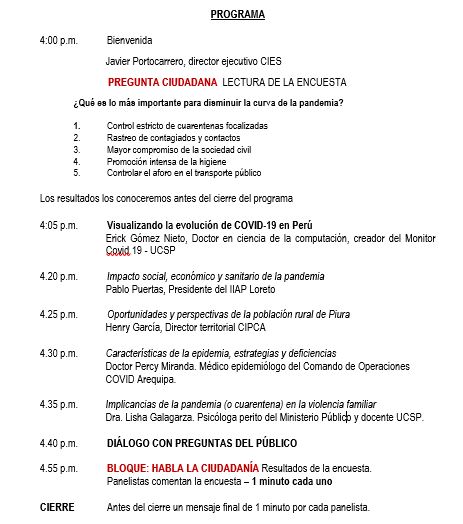 El Consorcio de Investigación y Estudios Sociales – CIES llevará a cabo el Quinto Diálogos Virtuales: Perú Sostenible denominado La pandemia: una mirada desde las regiones” donde se analizará lo que el país podría enfrentar, no sólo en la capital, sino en todas las regiones del país.