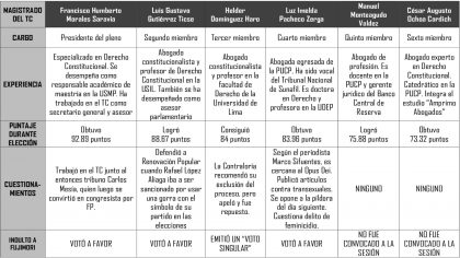 Los tribunos que conforman el TC son Francisco Morales Saravia, Luz Pacheco Zerga, Luis Gutiérrez Ticse, Helder Domínguez Haro, Manuel Monteagudo Valdez y César Ochoa Cardich.