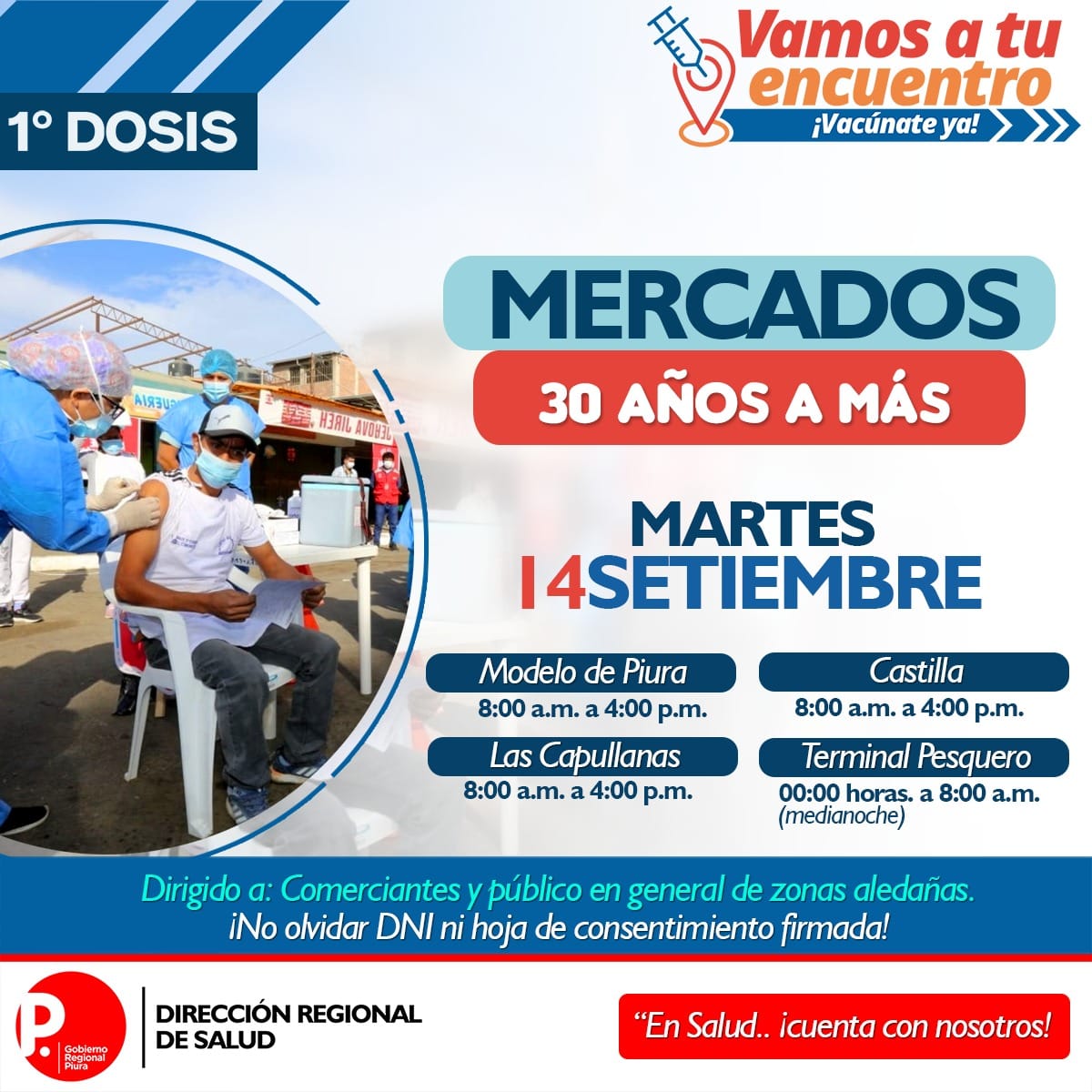 Las brigadas de salud estarán este martes 14 de setiembre en los mercados de Piura, Castilla, Las Capullanas y el Terminal Pesquero aplicando la primera dosis contra la covid a las personas mayores de 30 años, especialmente comerciantes y público en general de las zonas aledañas.
