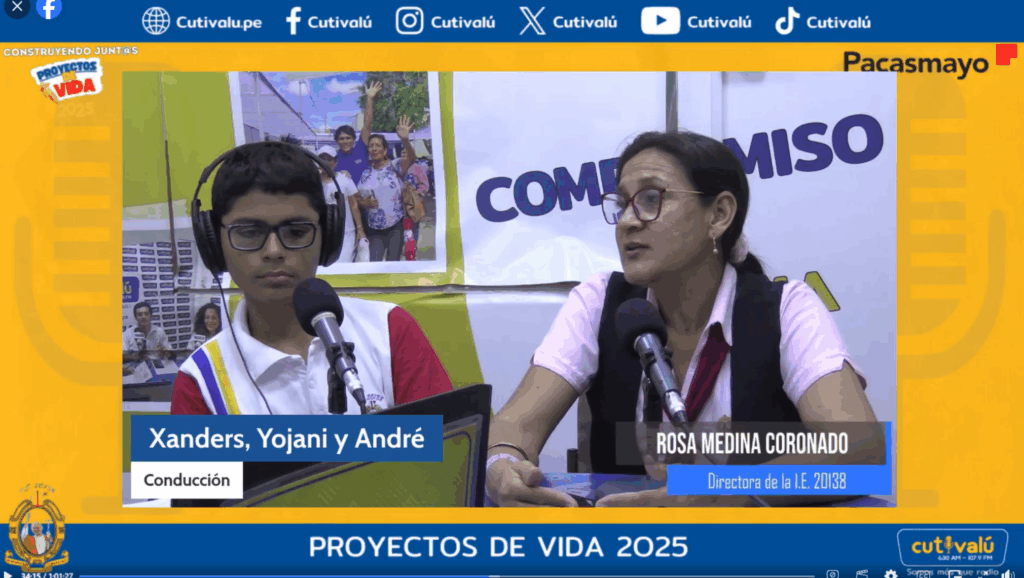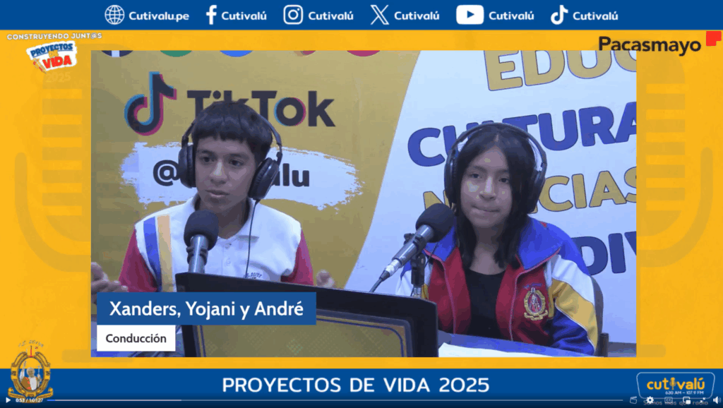 Con entusiasmo y seguridad frente al micrófono, las y los estudiantes de secundaria Xander, Johany y André de la Institución Educativa 20138 participaron como conductores de un programa especial transmitido por la multiplataforma de Cutivalú, en el marco del proyecto “Construyendo Juntos Proyectos de Vida 2025”, impulsado por Cementos Pacasmayo en alianza con Cutivalú. Esta actividad comunicacional permitió visibilizar los aprendizajes, reflexiones y avances alcanzados durante el año por las y los adolescentes del colegio.