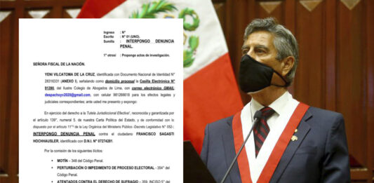 Yeni Vilcatoma, excongresista de Fuerza Popular, interpuso una denuncia penal ante la Fiscalía de la Nación contra el presidente de la República, Francisco Sagasti, por presuntamente haber perturbado el proceso electoral. En la denuncia Vilcatoma de la Cruz acusa al mandatario de la comisión de los supuestos delitos de: motín, perturbación o impedimento del proceso … Sigue leyendo Excongresista de Fuerza Popular denuncia a Sagasti por presunta “perturbación del proceso electoral”