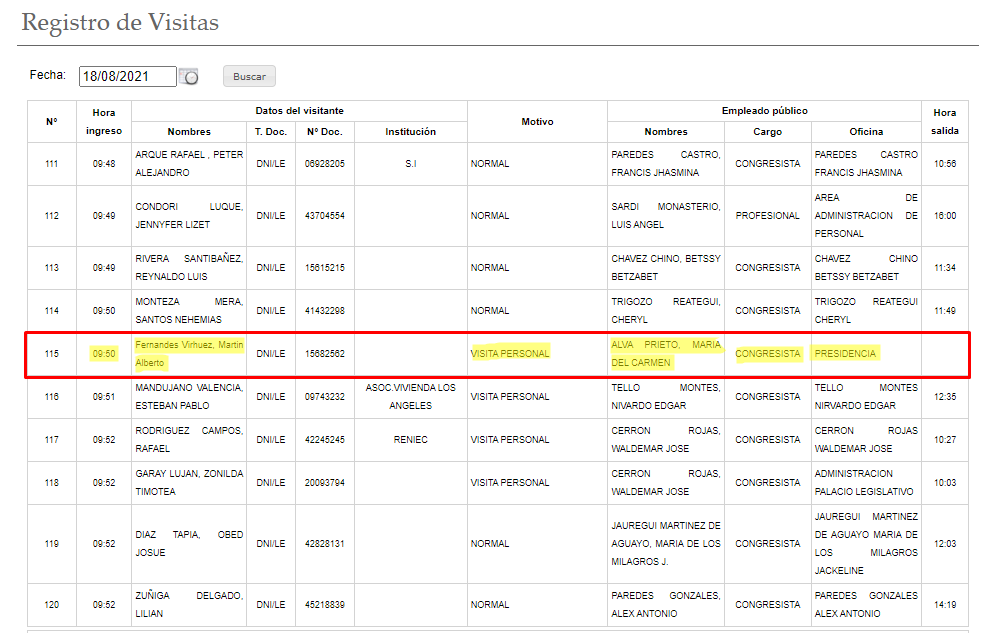 De acuerdo al registro de visitas del Parlamento, la mañana del pasado miércoles 18 de agosto la presidenta del Congreso, María del Carmen Alva Prieto (Acción Popular), recibió en su despacho a Martín Alberto Fernández Virhuez, un exoficial de la Marina de Guerra sentenciado por realizar espionaje telefónico para la empresa Business Track (BTR).
