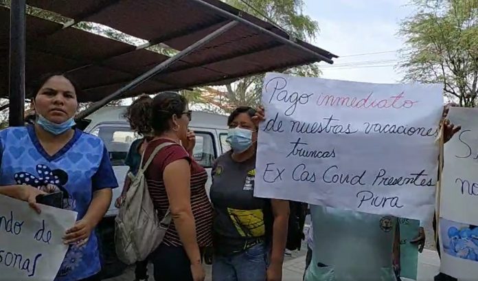 Un grupo de extrabajadores Cas COVID realizó una protesta en los exteriores de la Diresa Piura para exigir el pago de sus vacaciones truncas. Según señalaron los manifestantes, son más de 200 personas las que esperan desde hace meses que se les deposite el dinero de acuerdo a sus derechos laborales.
