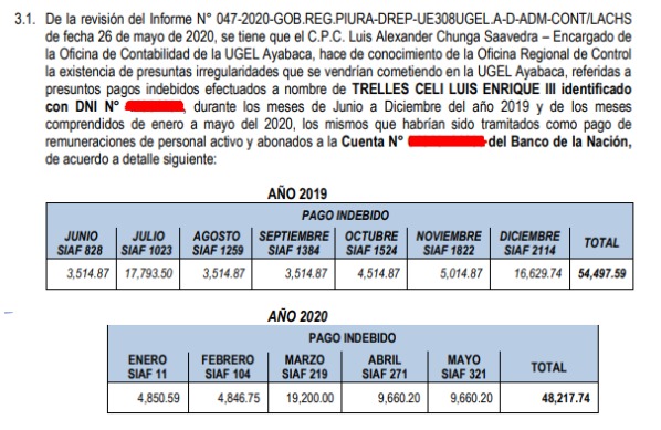 Como se recuerda, en julio de 2020, se conoció que la Unidad de Gestión Educativa Local (UGEL) de Ayabaca registró pagos por S/ 102 714 a favor de una persona identificada como Luis Enrique Trelles Celi. Sin embargo, según indagaciones preliminares del Sistema regional de lucha contra la corrupción, Trelles Celi no figuraba ni como trabajador administrativo y tampoco como docente de esta dependencia administrativa. En ese momento, Tomas Eca López, se desempeñaba como jefe de Administración; mientras que Joel Zamora Vignolo, era especialista de Personal.