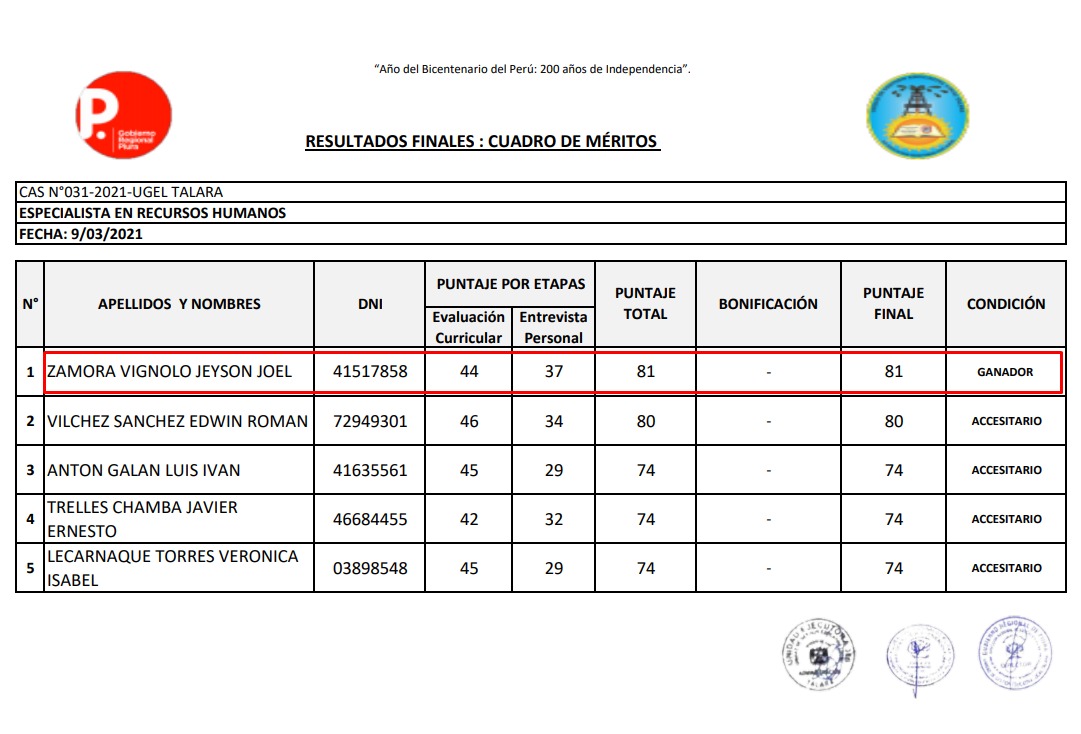 Al respecto, Cutivalú conversó con el director de la Ugel Talara, Juan Carlos Morán Rosillo, quien sostuvo que el Comité Evaluador de dicho proceso, no tenía conocimiento de los antecedentes de los dos postulantes por lo que pasaron todos los filtros de la evaluación sin ninguna observación.