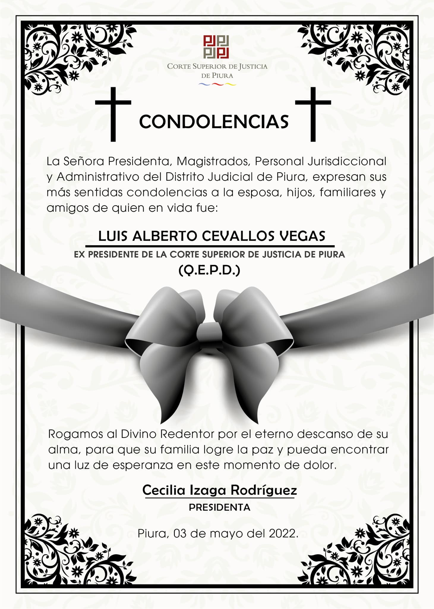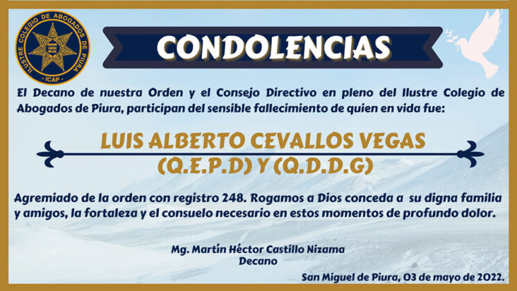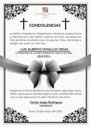 El expresidente de la Corte Superior de Justicia de Piura, Luis Cevallos Vegas, falleció la tarde de este martes 03 de mayo.