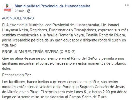 Diversos personajes e instituciones de Huancabamba también se suman a este dolor por este lamentable fallecimiento >>> Municipalidad Provincial de Huancabamba expresa sus más sentidas condolencias