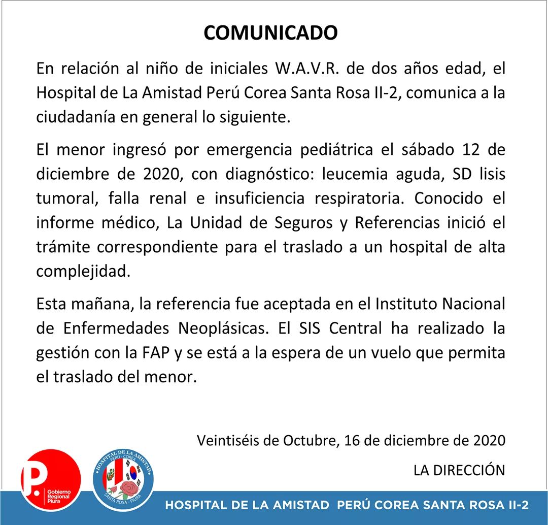 Antes de la penosa noticia, el Hospital Santa Rosa informó, mediante un comunicado de prensa- que el niño tenía diagnostico de leucemia aguda, SD lisis tumoral, falla renal e insuficiencia respiratoria.