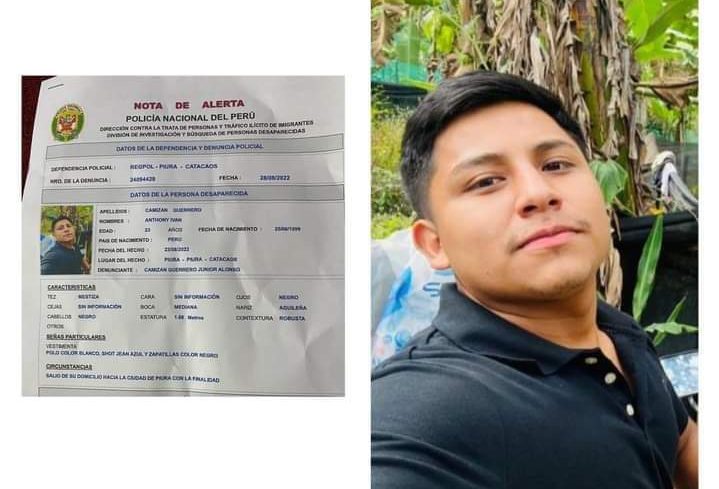 Anthony Camizán Guerrero (23), natural de Canchaque, fue reportado como desaparecido el pasado 21 de agosto, luego de salir de su domicilio. Él vestía un polo color blanco, short jean azul y zapatillas negras.