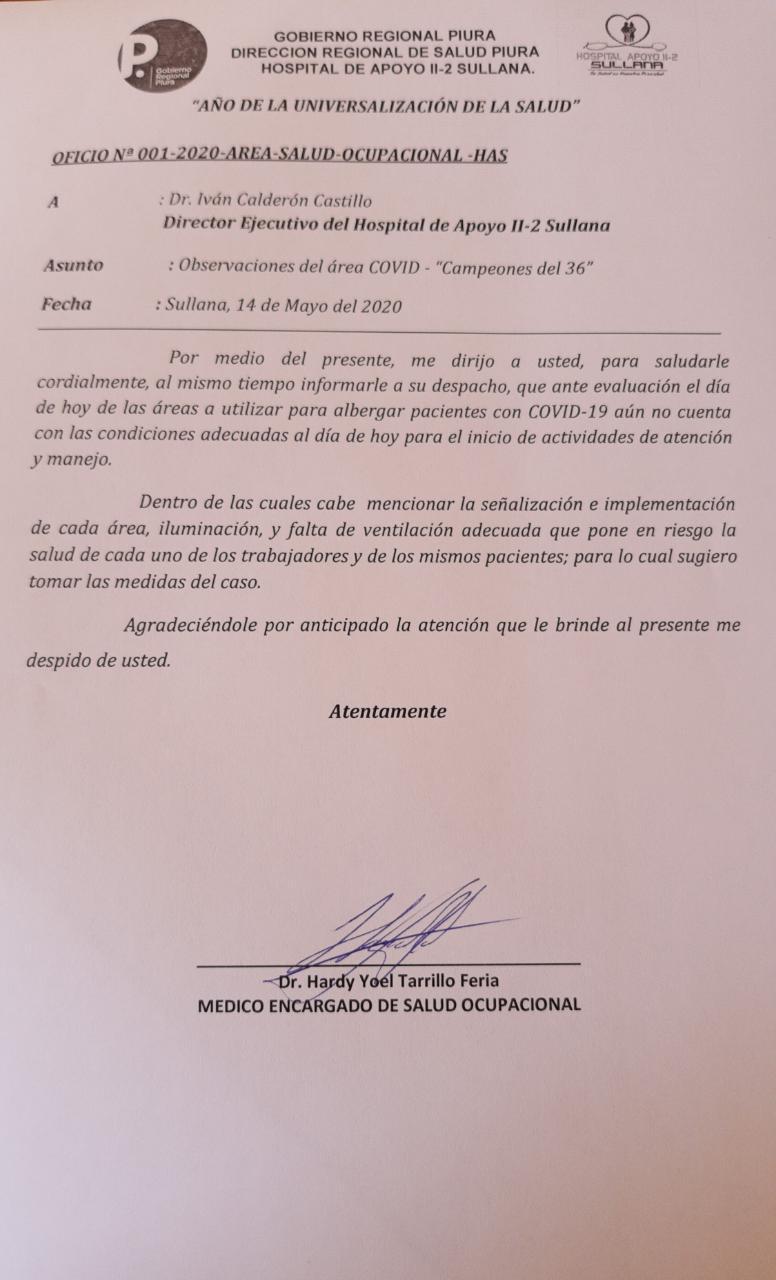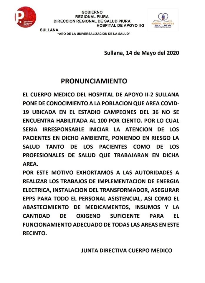 En un pronunciamiento los médicos del hospital de Sullana señalan: “Sería irresponsable iniciar la atención en dicho ambiente. Se pondría en riesgo la salud de los pacientes como de todos los profesionales de la salud. Pedimos culminar los trabajos de instalación de energía eléctrica, tener los suficientes EPP, medicina, insumos y oxígeno”.