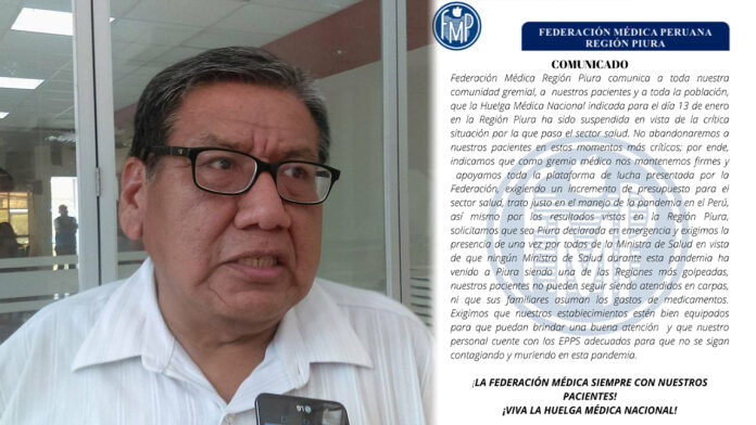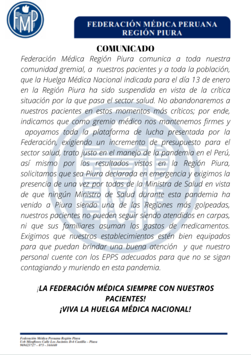 Según un comunicado publicado en el Facebook oficial de la Federación Médica de Piura, la institución anuncia la suspensión de la huelga que se había programado para este 13 de enero, debido a la situación crítica por el que pasa el sector salud de nuestra región debido a la pandemia.
