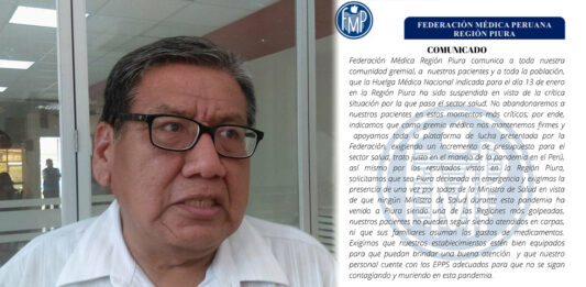 Según un comunicado publicado en el Facebook oficial de la Federación Médica de Piura, la institución anuncia la suspensión de la huelga que se había programado para este 13 de enero, debido a la situación crítica por el que pasa el sector salud de nuestra región debido a la pandemia. Así mismo indica que mantendrán … Sigue leyendo Federación Médica de Piura suspende inicio de huelga