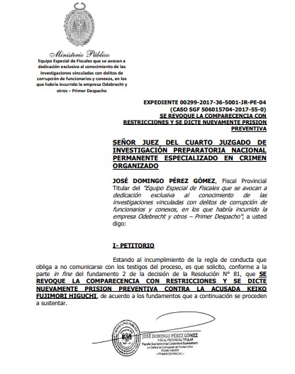 En su pedido, el fiscal Pérez recuerda que no es la primera vez que Keiko Fujimori incumple las reglas: “la acusada KEIKO FUJIMORI HIGUCHI sistemáticamente viene incumpliendo la regla de conducta de no comunicarse con los testigos”, cita el documento enfatizando que se le exhortó a la excongresista seguir las normas en mayo y junio del 2020.