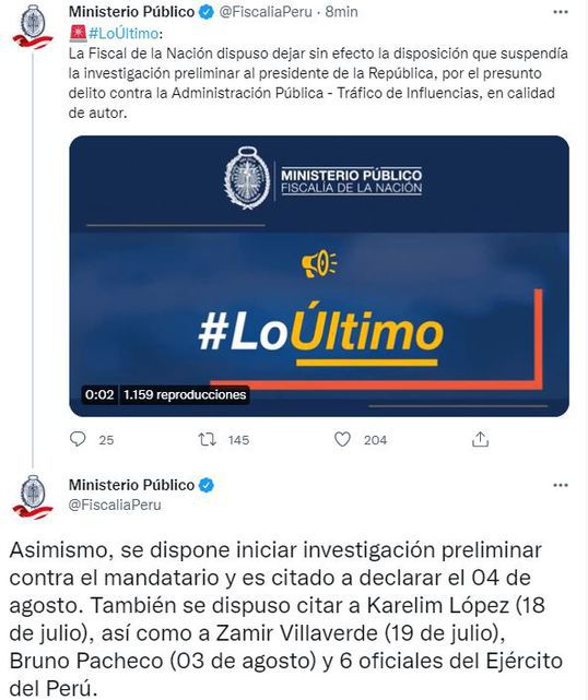 “Asimismo, se dispone iniciar investigación preliminar contra el mandatario y es citado a declarar el 04 de agosto. También se dispuso citar a Karelim López (18 de julio), así como a Zamir Villaverde (19 de julio), Bruno Pacheco (03 de agosto) y 6 oficiales del Ejército del Perú”, se lee.