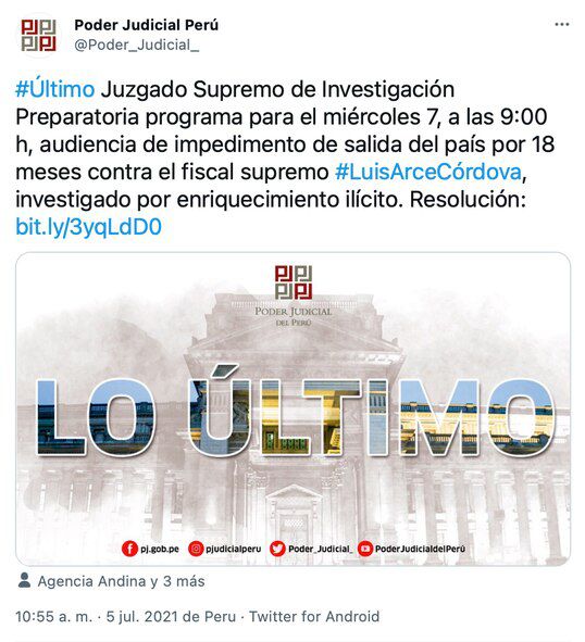 Tras el requerimiento del Ministerio Público, el Poder Judicial determinó realizar la audiencia de impedimento de salida del país contra Luis Arce Córdova el miércoles 7 de julio a las 9.00 a. m. Se precisó que la sesión será virtual por el contexto de la COVID-19.