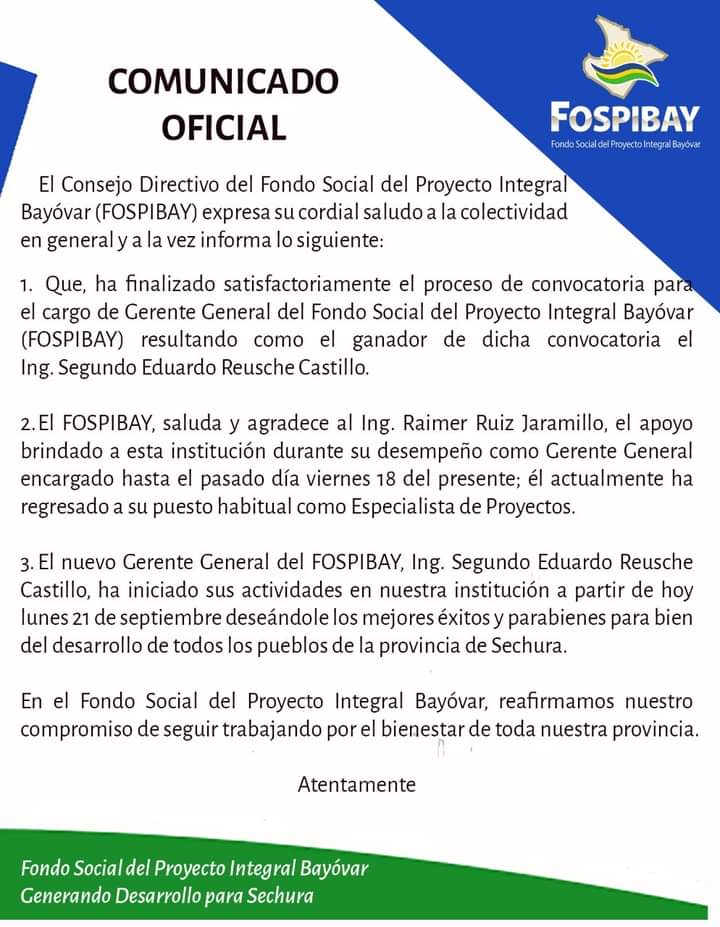 El ingeniero piurano Segundo Reusche Castillo asumió oficialmente como Gerente del Fondo Social del Proyecto Integral Bayóvar (Fospibay). Reusche Castillo es Past Decano Regional del Colegio de Ingenieros del Perú y actual Secretario Nacional de la misma institución. Ahora reemplaza en sus funciones al Ing. Raimer Ruiz Jaramillo, quien sigue laborando en el Fospibay como Especialista de Proyectos.