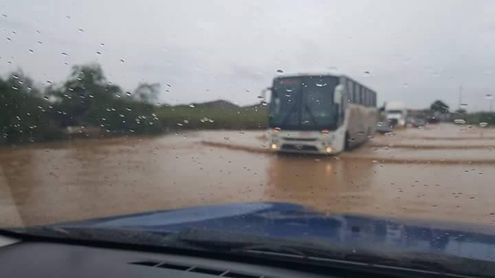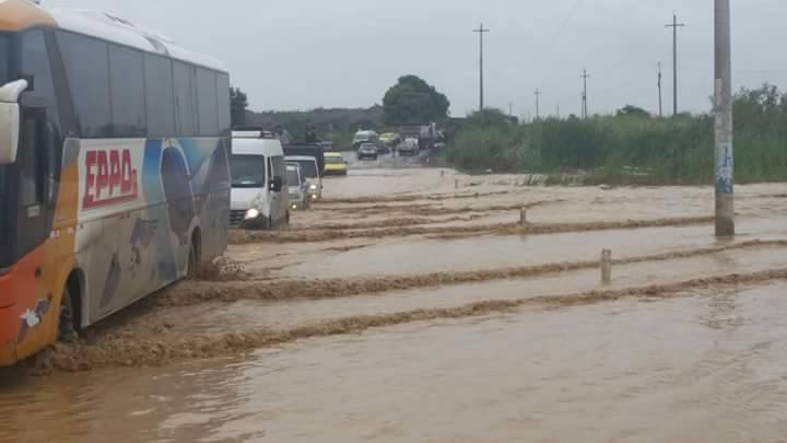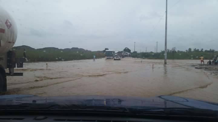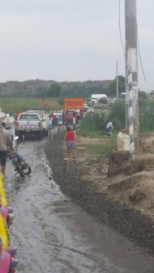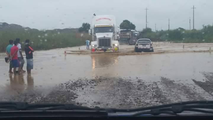 Varios autos, buses y tráileres que van de Sullana a Talara y viceversa, se arriesgan a cruzar esta vía a la altura  de la quebrada La Manuela que tras 10 horas de lluvia ha aumentado considerablemente su caudal.