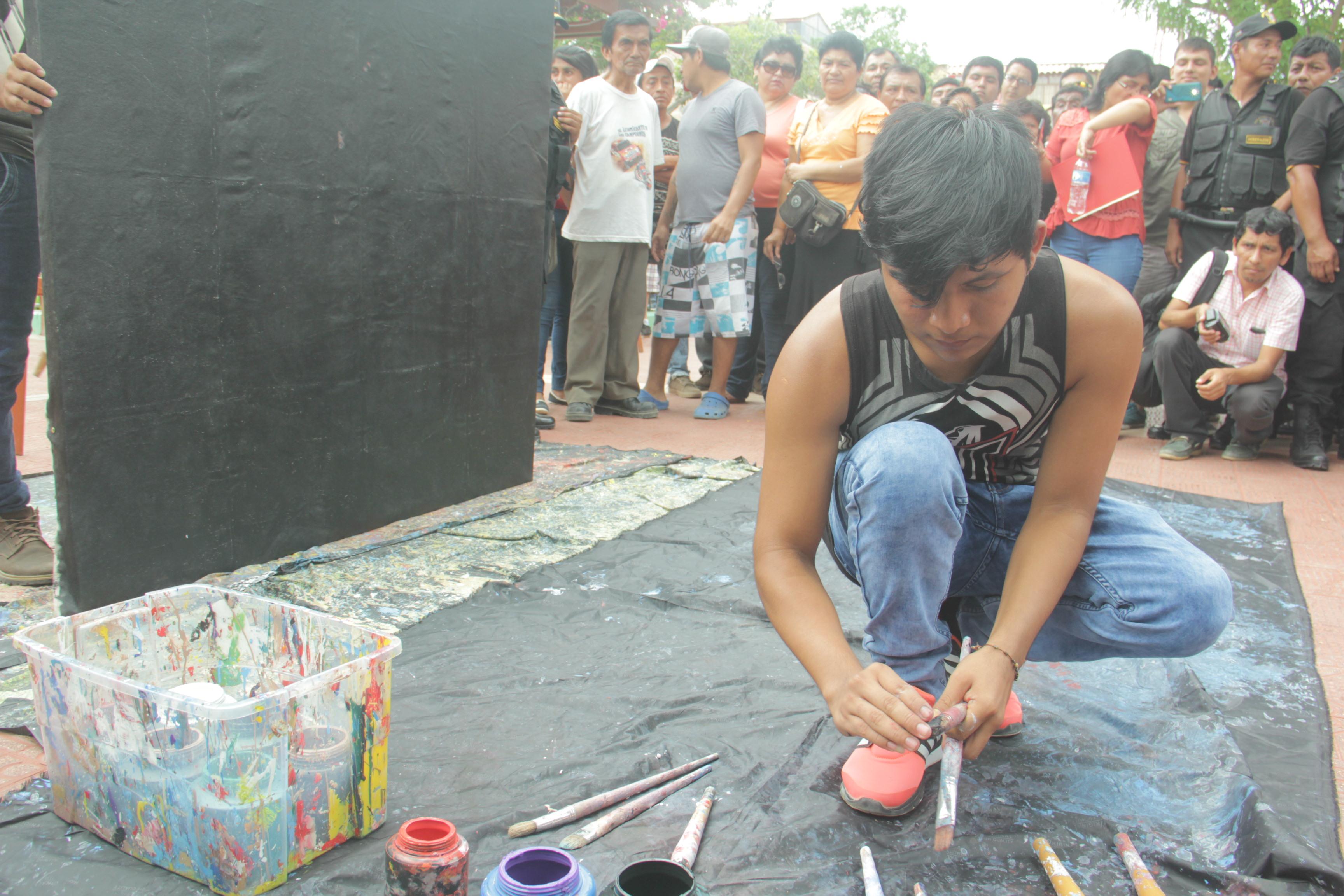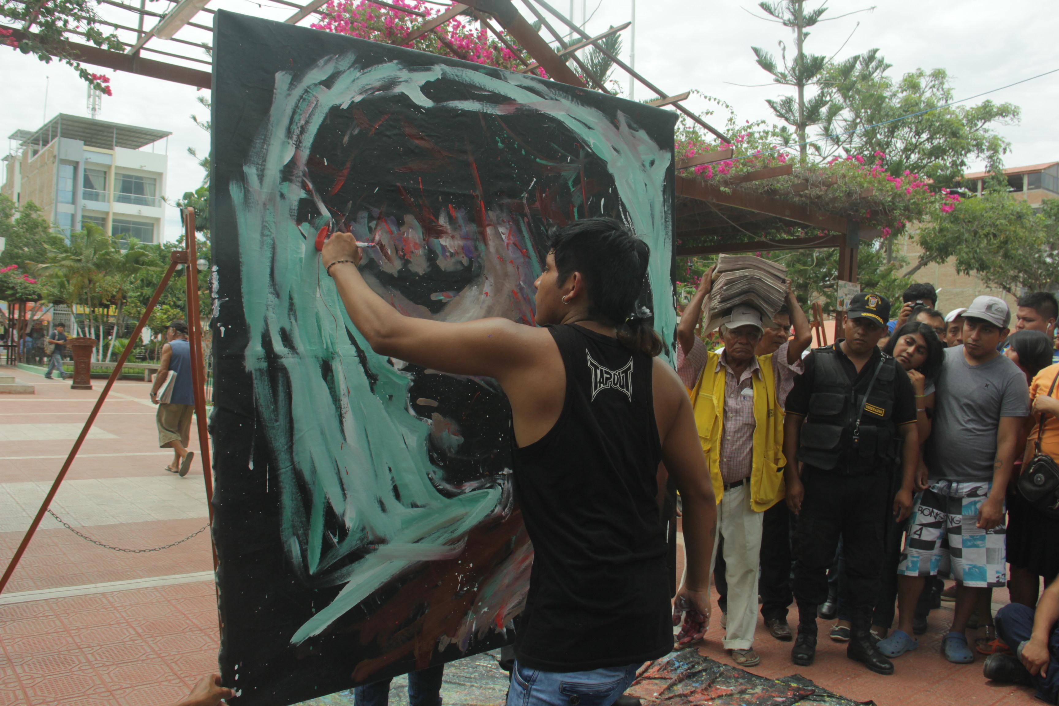 Decenas de periodistas, fotógrafos, curiosos y vecinos se agolparon en la plaza de armas para apreciarlo, mientras preparaba sus pinturas, tela y pinceles. Tras una transición de silencio inició la tarea.