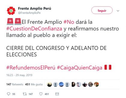 Por ello, anunció que como bancada del Frente Amplio han decidido que no darán la cuestión de confianza al Ejecutivo con el fin de que se adelanten elecciones parlamentarias. “La población no está dispuesta a esperar que los Becerril y compañía se queden hasta el 2021. Y este pedido de confianza no apunta a esto. El presidente debió ajustarse bien los pantalones y pedir una cuestión de confianza que esté a la altura de las exigencias.