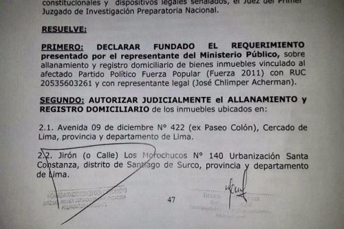 La Fiscalía está allanando y revisando documentación en dos locales del partido político Fuerza Popular, agrupación que lidera la excandidata presidencial Keiko Fujimori.