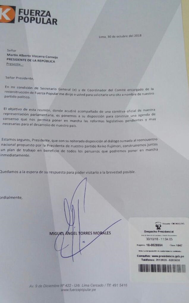 Fuerza Popular solicitó al presidente Martín Vizcarra una cita para «construir agenda de consenso». Mediante un documento, Miguel Torres, quien actualmente es “secretario general de coordinación del comité encargado de la reconstrucción de Fuerza Popular”, según señala, hizo la solicitud a nombre de su agrupación.