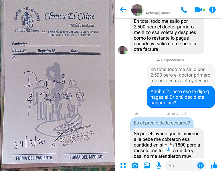 Susana fue de las gestantes que acudió a una clínica. Nos cuenta que el 24 de marzo acudió a la clínica Los Cocos porque no encontró atención en el SIS y Essalud. De inmediato le dijeron que debía dar a luz por cesárea. Por todo ello pagó 2 500 soles pese a que no la tuvieron ni 24 horas desde su ingreso pues al día siguiente de su operación le dieron de alta.