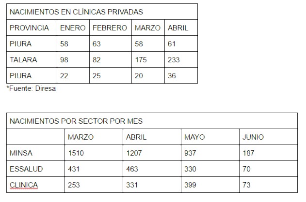Las cifras indican que los partos en clínicas aumentaron de 178 en enero y 173 en febrero a 253 en marzo, 330 en abril, y 278 en mayo. Sullana es la provincia que entre marzo y abril casi duplicó sus atenciones.