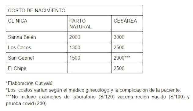 Los costos de dar a luz varían desde 1300 hasta los 3000 soles dependiendo la clínica, el ginecólogo que atenderá, y si será parto natural o cesárea. Estos montos no incluyen exámenes de laboratorio, la vacuna de recién nacido y la prueba de descarte de la covid 19.