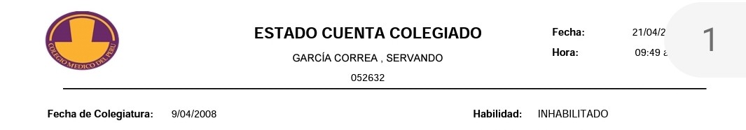 Según los registros de CMP, García Correa no habría cumplido con pagar la colegiatura mensual desde hace tres años. Por ello, la deuda asciende a S/ 1 125.